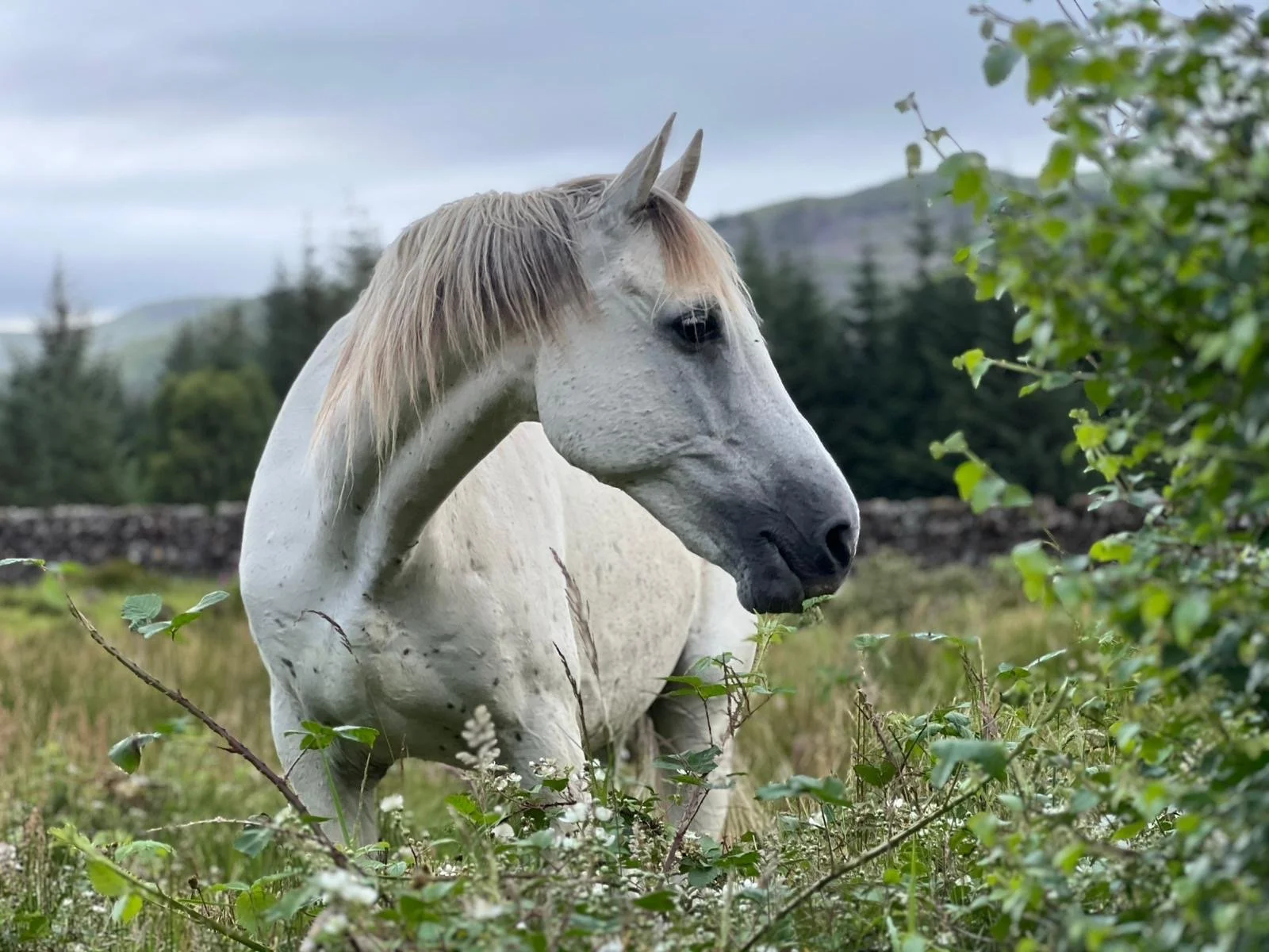 Faolan - “little wolf” - began life as a highly sensitive steel-grey colt, wary of people and full of sharp instincts. These characteristics supported him to become Lizzie’s lead adventure horse. Now thirteen, he has matured into a gentle, trusting presence and a very affectionate member of the herd.